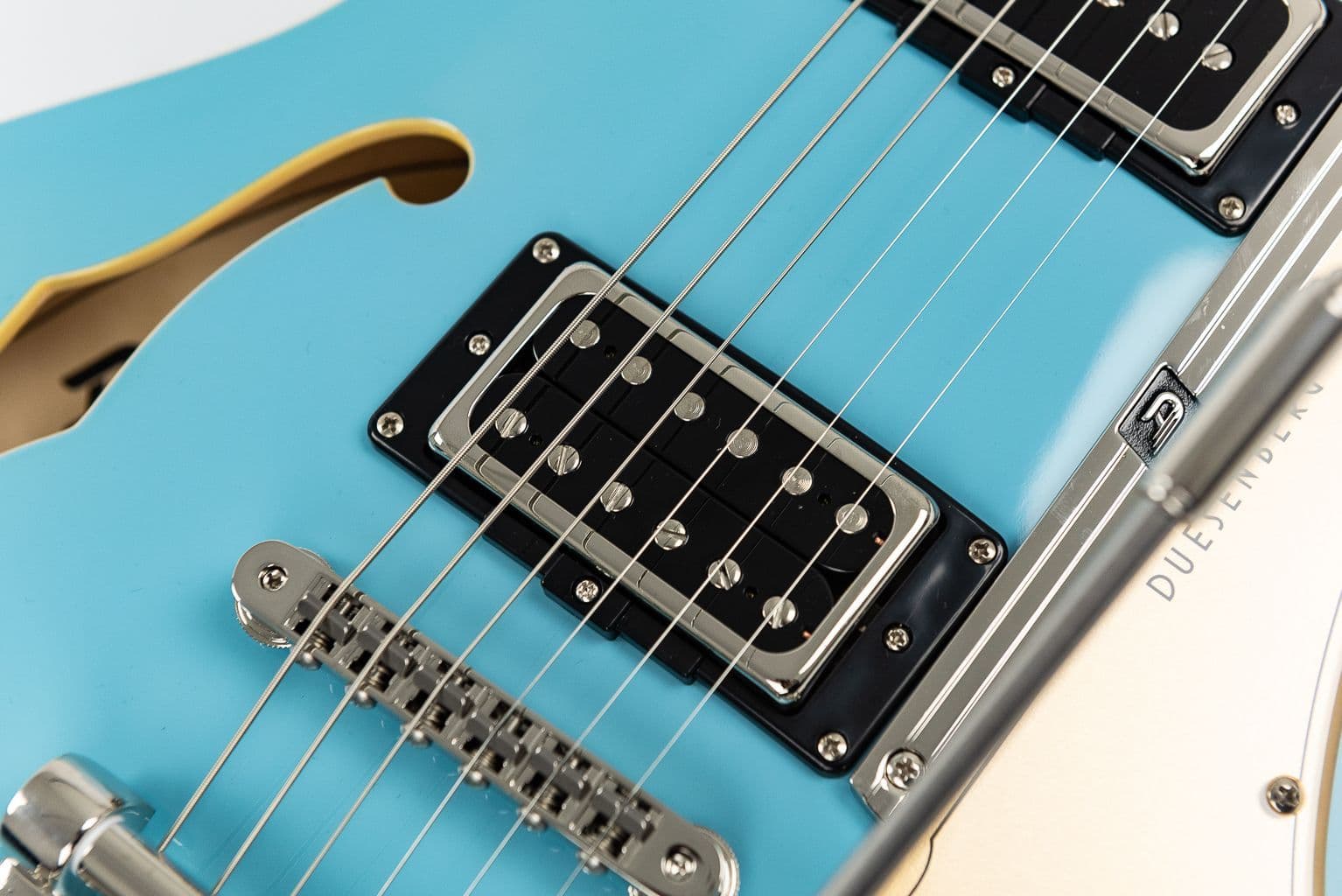 The tuners on this Duesenberg Starplayer TV in Narvik Blue are not only extremely precise and super comfortable to use, they also allow you to hide the sharp string ends inside the tuner shaft, so they don't damage your case, gigbag or fingertips. The creamy Domino P90 in the neck position and the classically voiced GrandVintage Humbucker at the bridge form an all-around dream team many have tried to replicate. The acclaimed middle position of the Heavy Duty 3-Way Switch features a special wiring which filters certain low-end frequencies out of the humbucker signal. The result is an open, funky and extremely versatile addition to your pallet of tone.