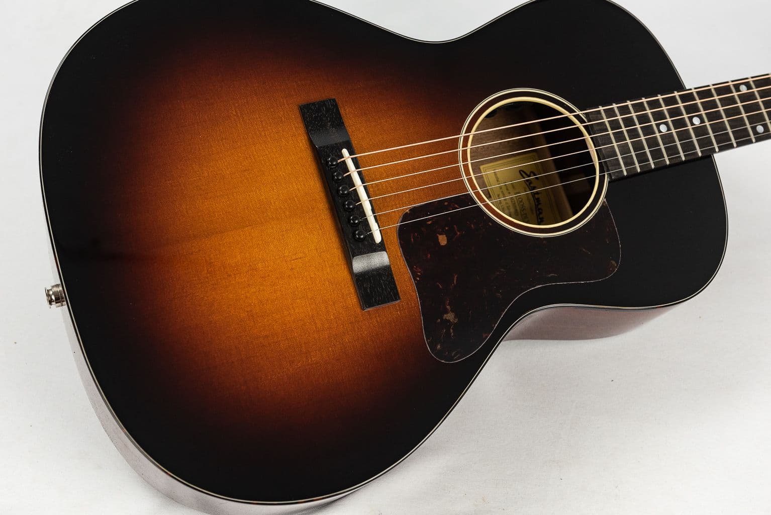 With all solid woods and factory fitted Fishman pickup system this lovely Sunburst 24.75" OO guitar takes a traditional approach and offers bags of character and style with impressive tonal performance. The ever popular OO body produces a great all round acoustic sound that is responsive and offers a nice blend of fundamental tone and harmonic content. In our opinion this Eastman E1OOSS Deluxe is one of the stars of the latest family of Eastman instruments. Check out the comfy Traditional Even "C" neck profile and Ebony 12" radius 43mm fingerboard with hand scalloped X bracing. Every design aspect and specification on this Eastman E1OOSS Deluxe has been carefully thought out and selected to ensure the player enjoys superb value and great performance.