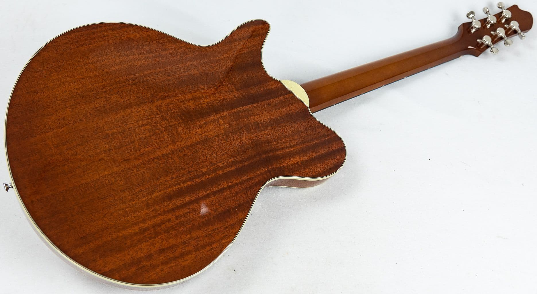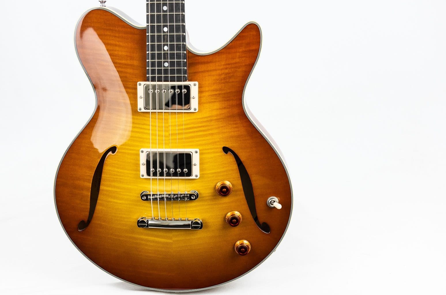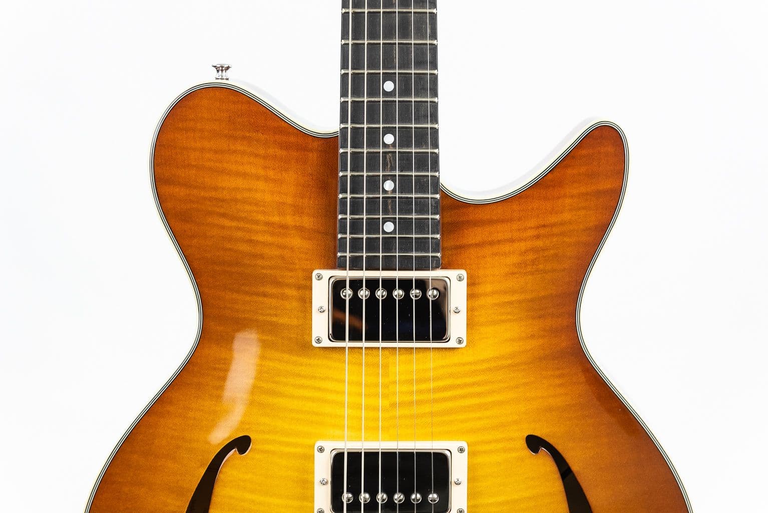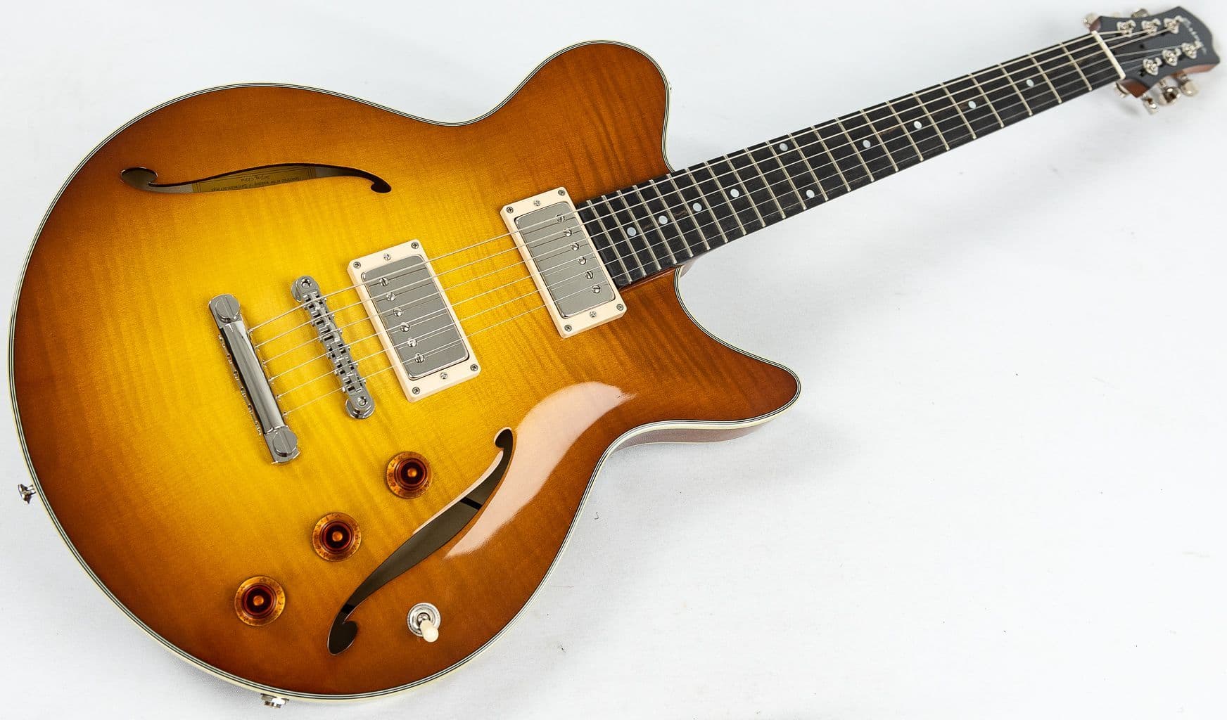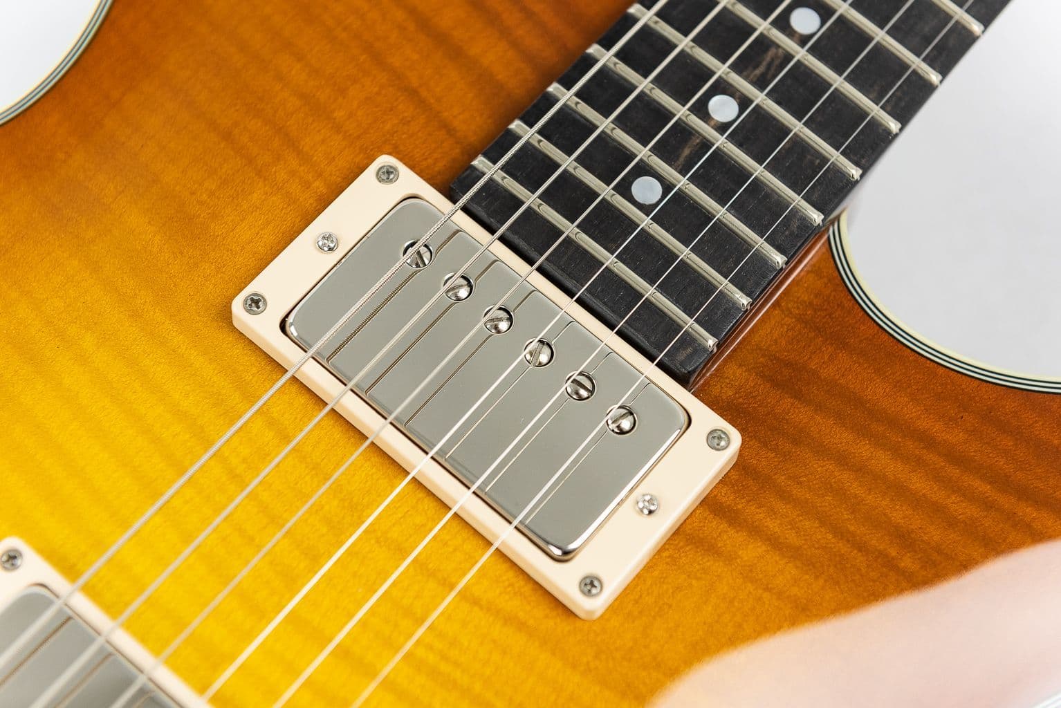With Flame Maple Laminate top and Mahogany back and sides this 7lbs 8.5oz creative verstaile 14.75" x 1.75" body build 6 string guitar has a lot of character and style on offer. We especailly enjoy the superb Bare Knuckle Old Guard Humbucking pickups and 24.75" scale intuitive 12" radius ebony fingerboard and Gotoh hardware. Thsi stunning Eastman Romeo California in Goldburst has bene hand made in a traditional workshop and comes with an extensive list of impressive features and specifications. Check out the MGDBL33N Back Locking Tuners and high spec circuitry. In a range of fine expertly crafted musical instruments its hard to pick the most stand out models, but surely this Eastman Romeo California Goldburst has to be in for a chance to win the best Eastman electric guitar award. Its a totally lovely electric guitar and comes complete with hardshell case.