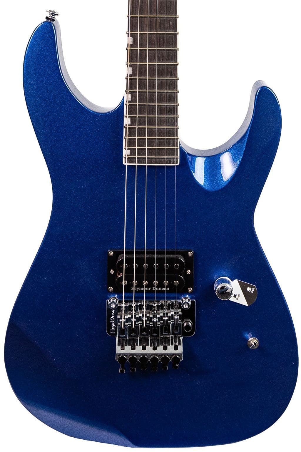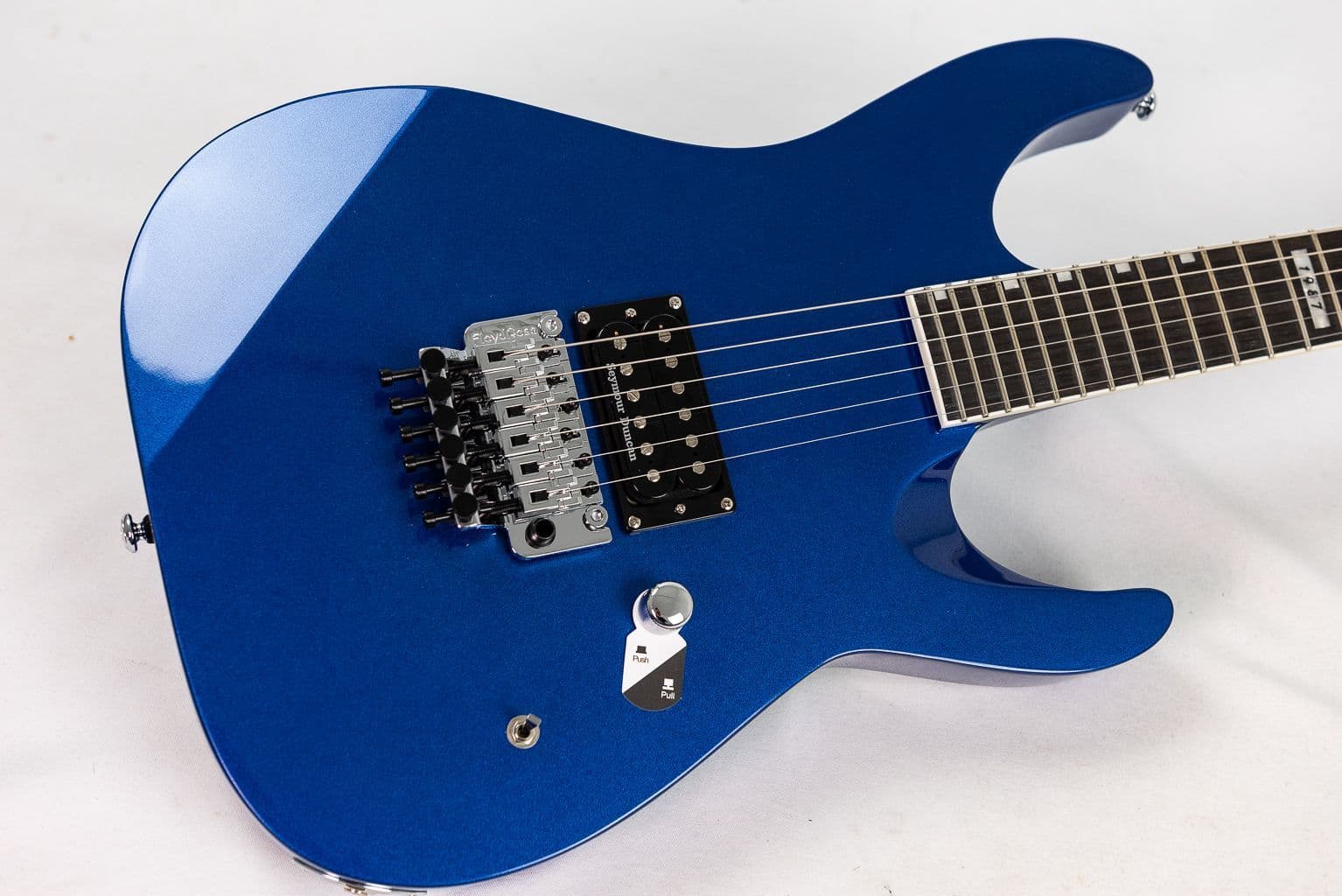 This 24 fret alder body thru neck build Floyd Rose 1000 loaded LTD M-1 Custom ’87 guitar in dark metallic blue is based on the legendary original ESP M-1 model. Check out the 3 piece maple neck and macassar ebony fingerboard. It offers enhanced neck-fast access to the highest frets and comes with a very capibale single Seymour Duncan Distortion TB-6 pickup with a push-pull control for coil splitting, and an EMG PA-2 boost switch for when you need that extra push of raw power.