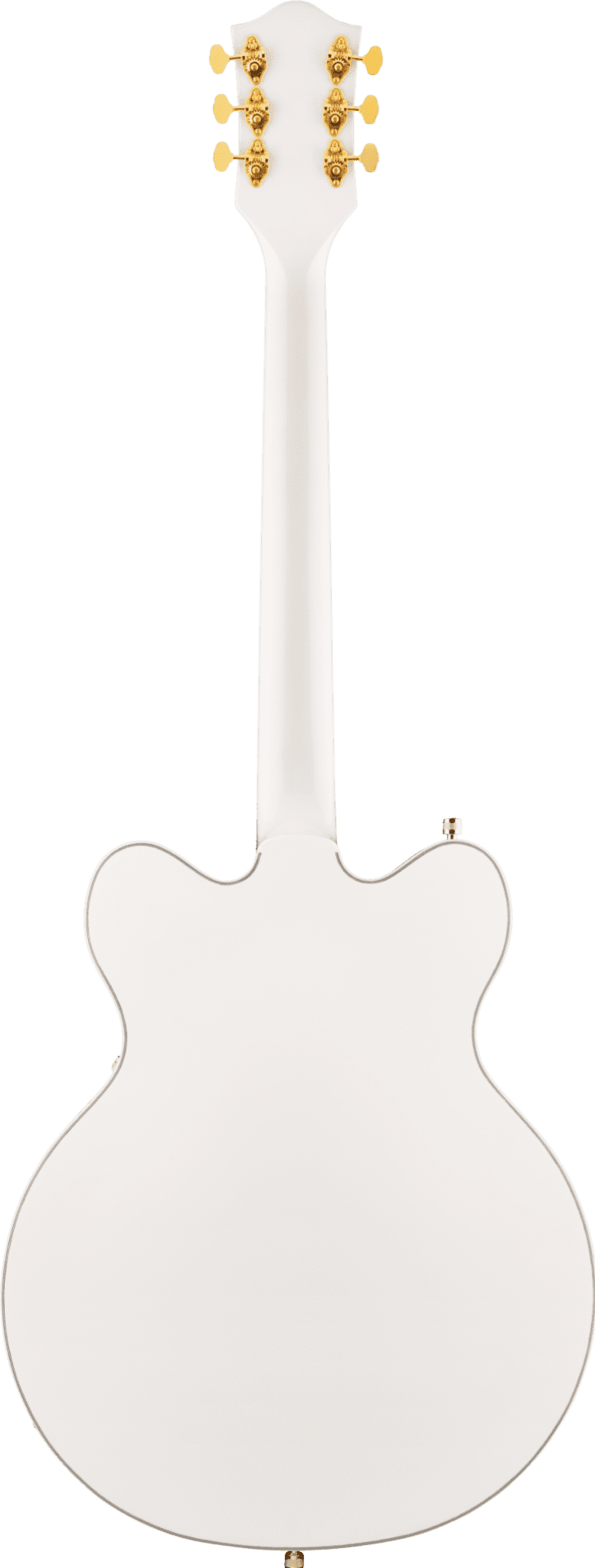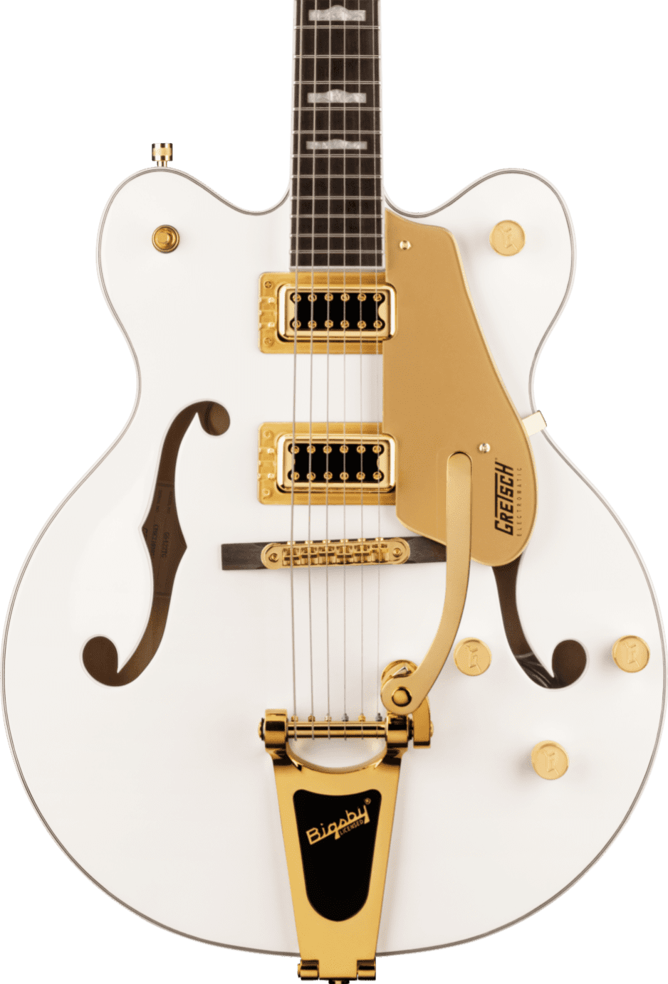 This Snowcrest White G5422TG Electromatic Classic Hollow Body Double-Cut with Bigsby and Gold Hardware features a laminated maple body with vintage-inspired perimeters and refined arches, as well as all-new trestle block bracing to help reduce unwanted feedback. By increasing rigidity and contact between the top and back of the body, the new trestle block design also results in the sound having a faster attack with more focus, snap, and increased sustain. Coupled with all-new FT-5E Filter'Tron pickups, this hollow build's voice explodes with huge full-bodied punch, classic chime and enhanced presence, clarity and note definition.