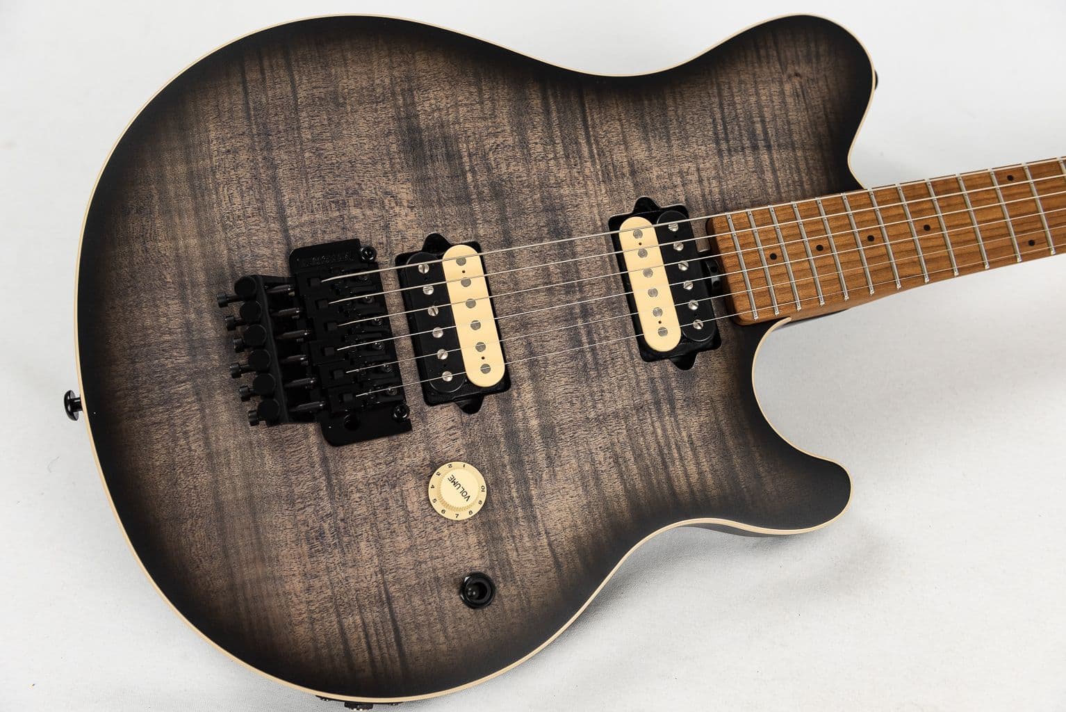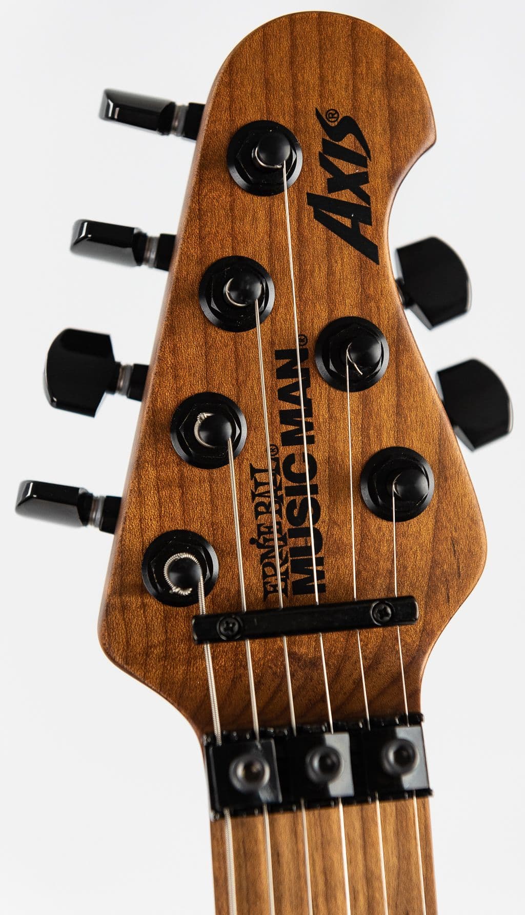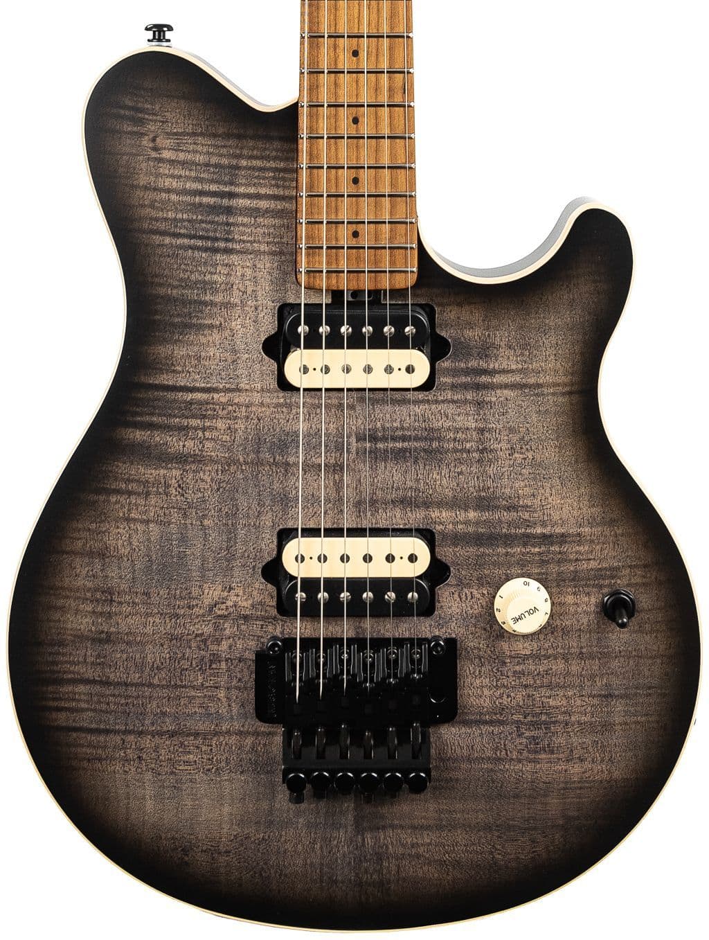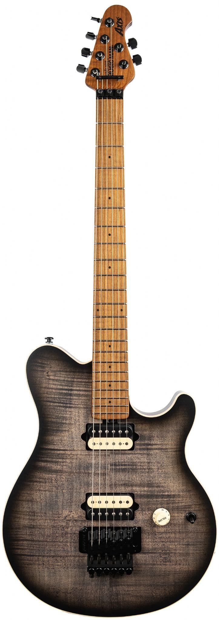 The Axis guitar is has a roasted gunstock oil hand-rubbed with special wax blend figured maple neck and 22 stainless steel frets. Charcoal Cloud. This very latest spec Music Man Axis charcoal Cloud flame guitar retains the features that have made it a true classic, such as the ever-comfortable asymmetric neck shape, double-locking tremolo, and proprietary DiMarzio humbucking pickups. The flame top over a basswood body tonewood and pickup combination is a perfect recipe for hard-edge rock tones but also delivers a subtle dynamic response at lower volume levels when needed.