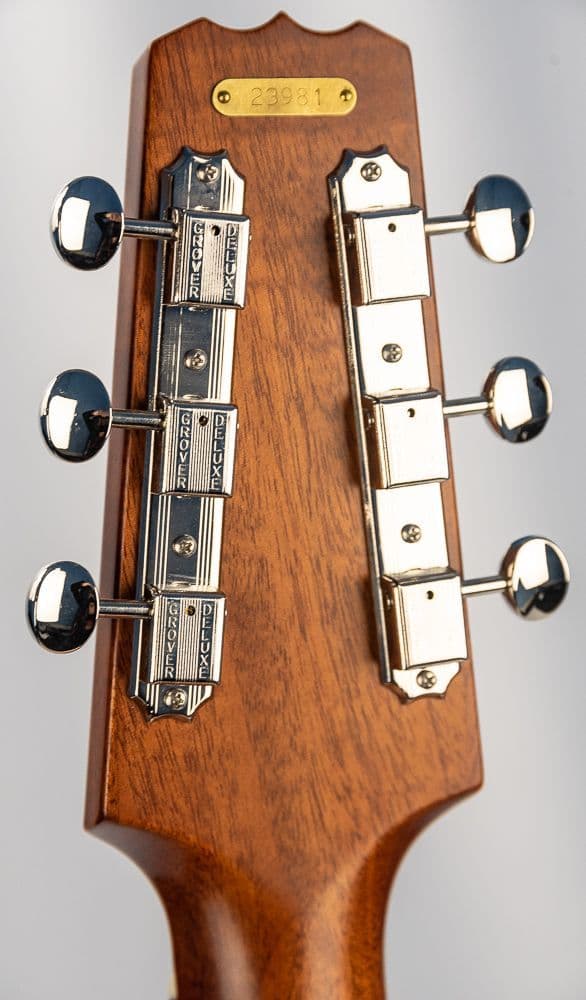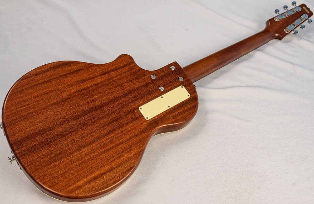 Our Resolectric has gone through a few changes in its 20 years of production. The current model uses an audiophile-quality Highlander preamp to mix both the magnetic and piezoelectric pickups. A Jason Lollar P-90 pickup sits in the neck position, and a Highlander piezo transducer is fitted under the saddle. The output of each pickup is controlled by independent volume knobs, with a master volume knob to control the instrument's overall output level. A 3-way toggle switch selects which pickups are active. The solid mahogany body is capped with a figured maple top bound in ivoroid. The figured maple neck clears 14 frets to the body, highlighted with a diamond inlaid, ebony fretboard.Standard