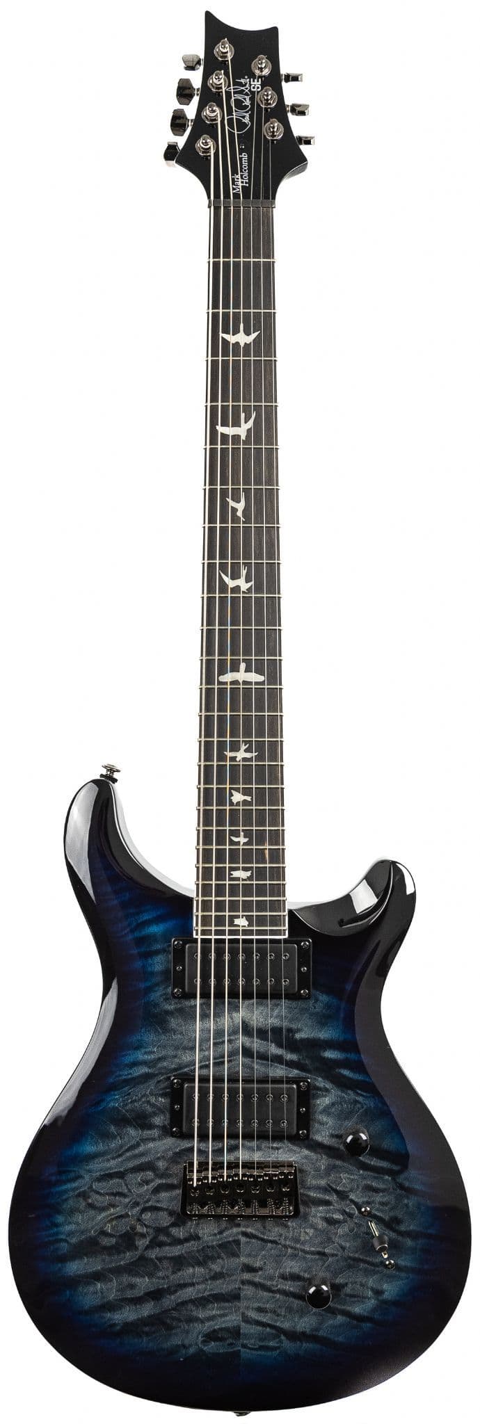 Fresh in we are very pleased with the figuring on this Quilted Maple top PRS SE Mark Holcomb Signature 7 Holcomb Blue Burst guitar signed by the man himself, Mark Holcomb. This 7 string version has a 26.5" scale and comes with an intuitive 20" radius 24 fret Ebony fingerboard with bird inlays, Taking the PRS guitars we all love and twisting some individual design specifications, this extremely creative PRS SE Mark Holcomb Signature guitar has a lot to offer. The “Scarlet” and “Scourge” Seymour Duncan pickups and Black Chrome PRS hardware have this guitar ready for heavy duty work in the studio, on stage, or in the front room. Includes a Gigbag.