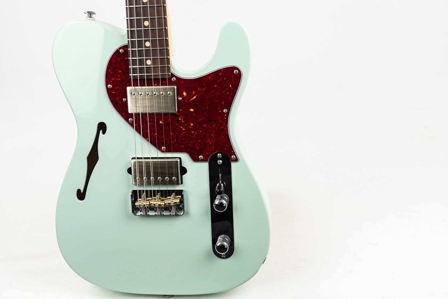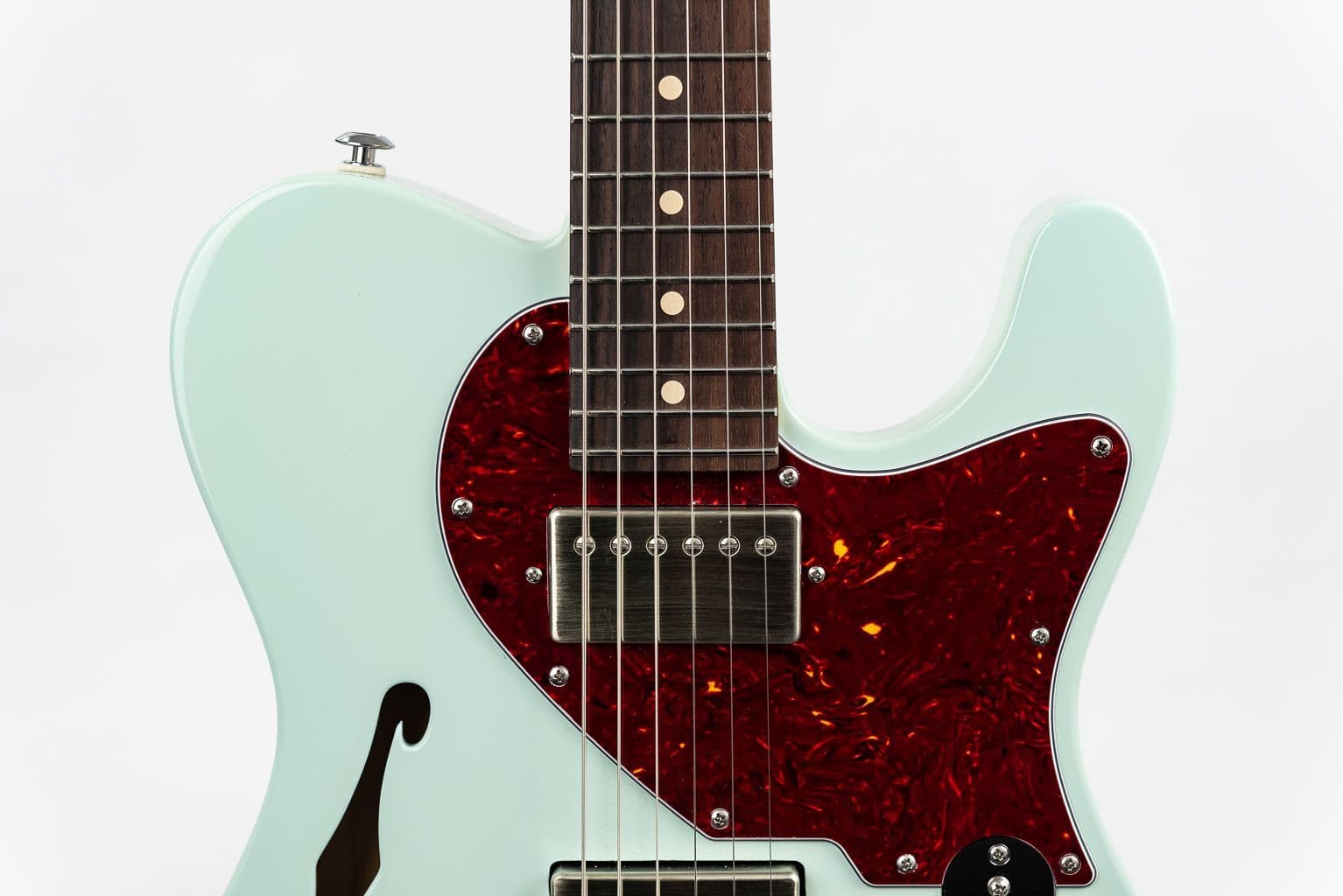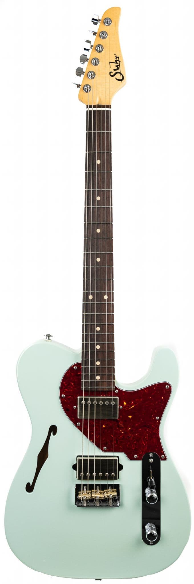 9" - 12" Compound Rosewood fingerboard, Suhr Locking tuners, Medium Stainless Steel frets, and Chopped Classic T bridge. This chambered Alder body F Hole design thinline Suhr Alt T also has 60's C Vintage Medium .830" - .950" neck profile and SSV pickups. This SSV (Raw Nickel) loaded Suhr Alt T in Sonic Blue is a most creative and inspiring guitar. it responds to the lightest of touches and offers the player a wonderful blend of tonal character and meticulous attention to detail.