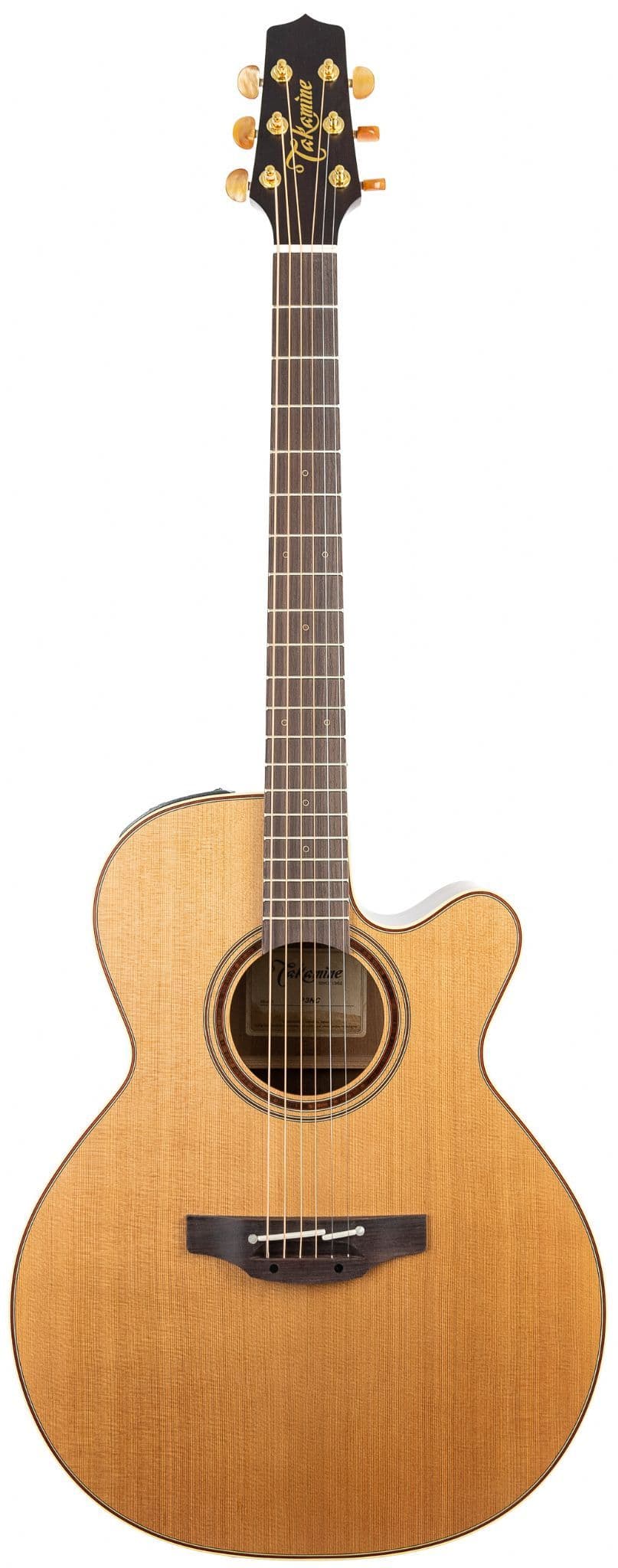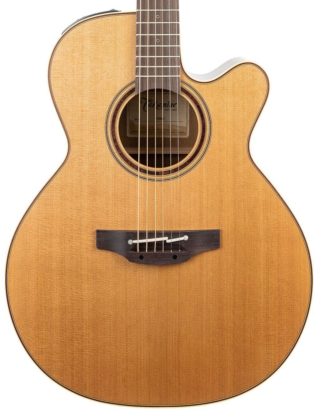 The 3 series Japanese built 42.5mm nut size range combines some especially tasteful understated finishing touches. This Takmaine P3NC comes with carefully selected specifications and a wonderful solid cedar top along with world famous pickup system. The sweet but clear sounding Palathetic pickup has latest spec CT4BII pre amp and includes official case. the Takmaine P3NC has a versatile NEX body size, which is a highly versatile choice and sits somewhere between an OM and a Dreadnought ensuring this guitar can play every style effortlessly. Features on this Japanese crafted Takamine P3NC include a split-saddle bone bridge, faultless intonation and excellent acoustic coupling to the top. A solid sapele back, mahogany neck, rosewood fingerboard with wood “dot-in-dot” inlays, gold tuners with amber buttons, natural satin finish and the highly acclaimed three-band EQ, volume control and built-in tuner.